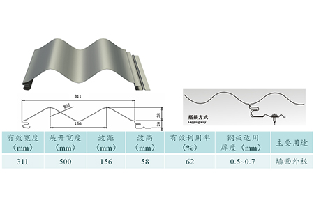 ● HL58-311型隱藏釘式墻板,使用展開寬度為500mm的彩涂板,適合厚度0.5-0.7mm。適應(yīng)于橫鋪墻面。表面為波浪型,承載能力強、外觀新穎、美觀大方,獨特的防水性能,主要適用于辦公樓、工業(yè)廠房、大型的公共建筑物墻面。